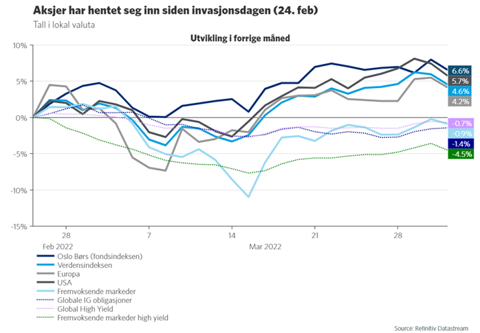 Krigen i Ukraina er ved inngangen til april inne i sin sjette uke. Krigens utvikling preger fortsatt markedene og sentimentet i stor grad. Det er samtidig lite informasjon å lese i børskursene nå, ettersom det fortsatt er stor usikkerhet knyttet til hvor lenge krigen vil vare, og effekten den har på økonomisk vekst i det korte og lange bildet. Aksjemarkedene trekker foreløpig et lettelsens sukk for at ting ikke har utviklet seg verre enn det har gjort og avslutter måneden med positivt fortegn. I det korte bildet er narrativet at krigen vil legge en demper på global vekst, samtidig som inflasjonen sannsynligvis vil holde seg på høye eller høyere nivåer en periode. Husholdninger får redusert kjøpekraft, men effekten forventes å bli dempet som resultat av høy akkumulert sparing de siste årene.