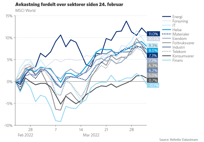 Krigen i Ukraina skapte betydelig volatilitet i starten av måneden. Investorer kunne observere flere handelsdager som startet med nedgang på over fire prosent, for så å ende dagen i pluss, og vica versa. Siste del av måneden bød på betydelig mindre svingninger, børsene har vært mindre sensitive til nyheter fra krigen, spesielt ved innføring av nye sanksjoner. Energiprisene er fortsatt svært volatile, energiselskapenes aksjekurser har danset i takt med oljeprisen som den 8. mars bikket 130 USD/fatet. Hittil i år er energisektoren fortsatt en klar vinner, men oppgangen som har vært siden 7. mars har vært på bred og på tvers av sektorer, med unntak av finansaksjer og konsumvarer.